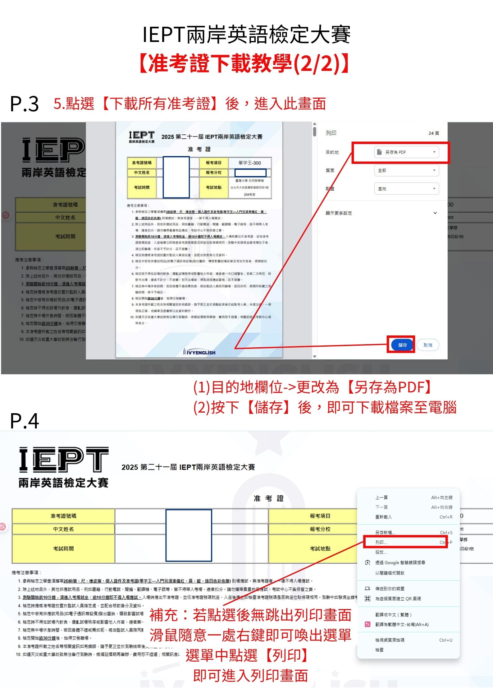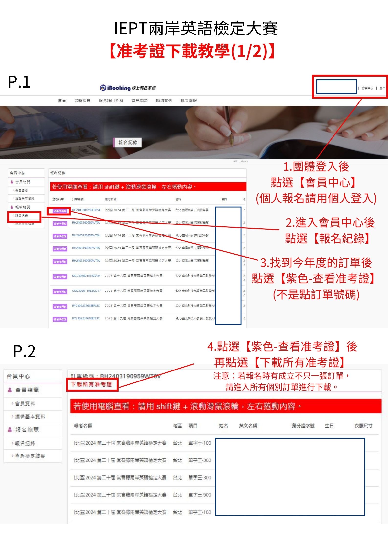 本屆【IEPT 兩岸英語檢定大賽】准考證於2026/04/08(三)16:00後可自行至報名系統下載並列印。